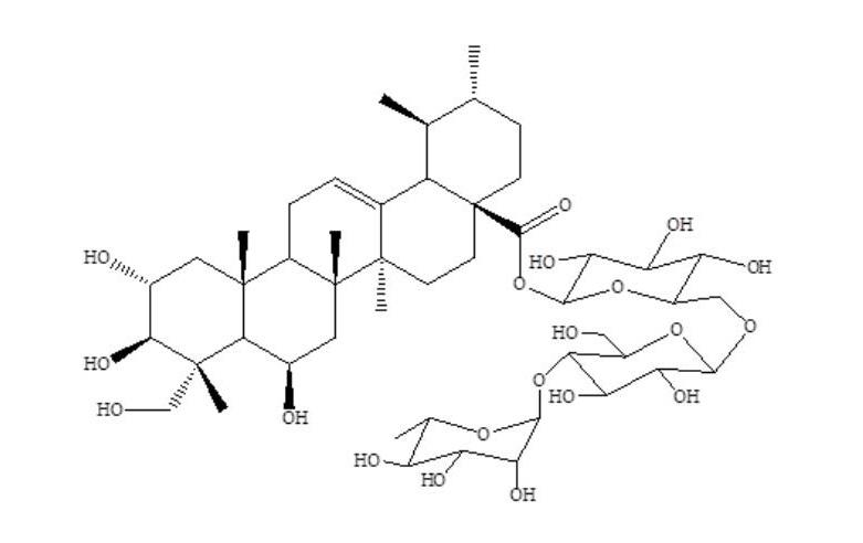 【英文別稱】 O-6-deoxy-alpha-L-mannopyranosyl-(1->4)-O-beta-D-glucopyranosyl-(1->6)-beta-D-glucopyranosyl (2alpha,3beta,4alpha,6beta)-2,3,6,23-tetrahydroxyurs-12-en-28-oate